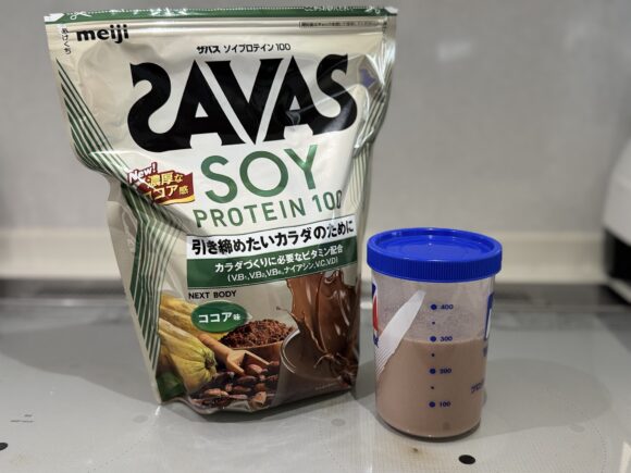それから、トレーニング後に**『ザバス ソイプロテイン 100』**を愛用しています。