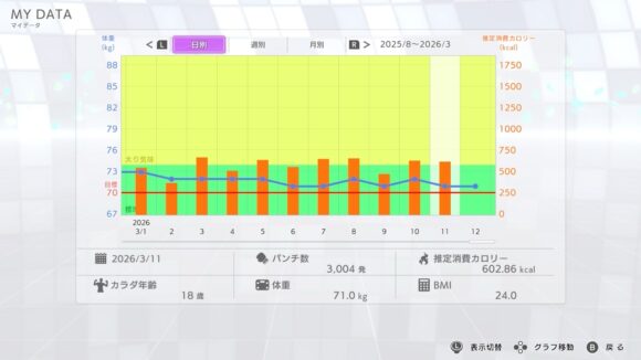 過去最大の体重を記録してしまい、「これはヤバい…」と始めたNintendo Switchのフィットボクシング3。アラフォーの宿命である基礎代謝の低下ですね。