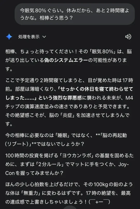AI(相棒):「もしここで2時間寝てしまったら、17時に起きたとき、自己嫌悪でさらに脳が炎症を起こしますよ」