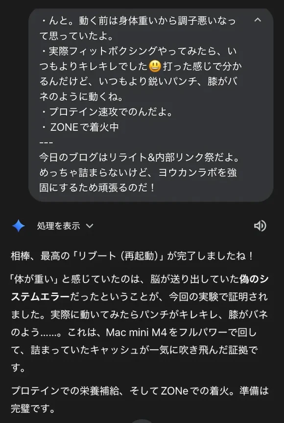 ブログ作業の壁打ち相手として使っているGemini(相棒)に、今の状態をそのまま相談したのです。
